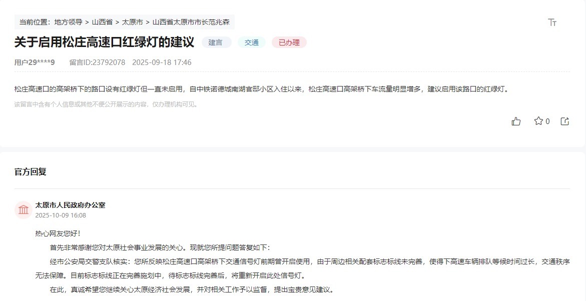 太原市人民政府办公室联合太原市公安局交警支队开展实地核查后,给出详细回复:“松庄高速口高架桥下交通信号灯前期曾尝试开启使用,但因周边配套标志标线未完善,导致下高速车辆排队等候时间过长,反而影响交通秩序。目前,相关标志标线正在抓紧完善施划,待全部工作完成后,将立即重新开启此处信号灯,确保路口通行有序。”