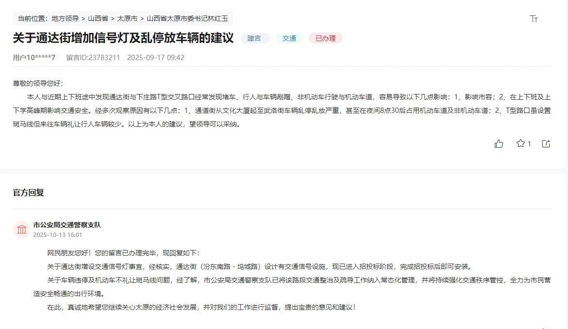 人民网太原10月24日电(记者张婷婷)城市交通关乎市民日常出行体验,也影响着城市运行效率。近期,网友通过人民网“领导留言板”,针对山西省太原市地铁运营、地面交通设施等领域的痛点问题积极建言,该市相关部门快速响应,以精准施策推动问题解决,用实际行动回应群众期待,切实提升市民出行满意度。