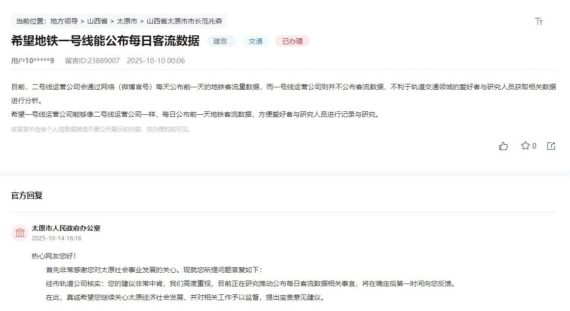 接到留言后,太原市人民政府办公室高度重视,第一时间转交市轨道公司核实处理。经研究,官方明确回复:“您的建议非常中肯,我们高度重视,目前正在研究推动公布每日客流数据相关事宜,将在确定具体方案后第一时间向您反馈。”