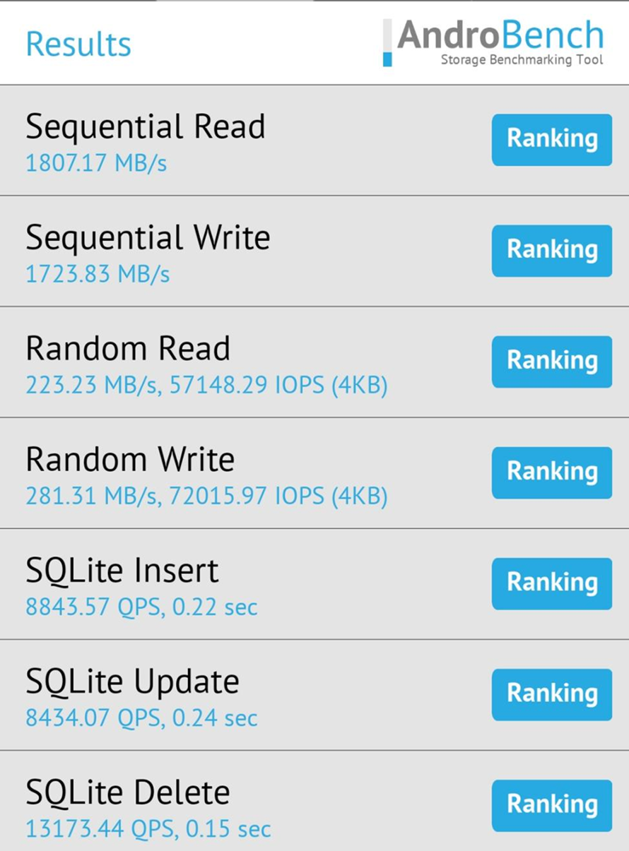 除了安兔兔之外,我们还选择主流的AndroBench进行闪存速度的测试,结果与安兔兔差不多。其中读取速度为1807MB/s,写入速度为1723MB/s,完全可以满足日常使用需求。