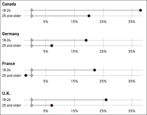 加拿大、德国、法国、英国受访者对中国和特朗普治下美国的看法